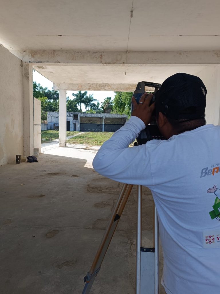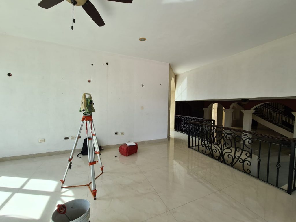 Un topógrafo profesional con camisa blanca de manga larga con logotipos (como el de Geoland) y gorra opera una estación total en trípode en el interior de una habitación con paredes de piedra y yeso rústicas y desgastadas.