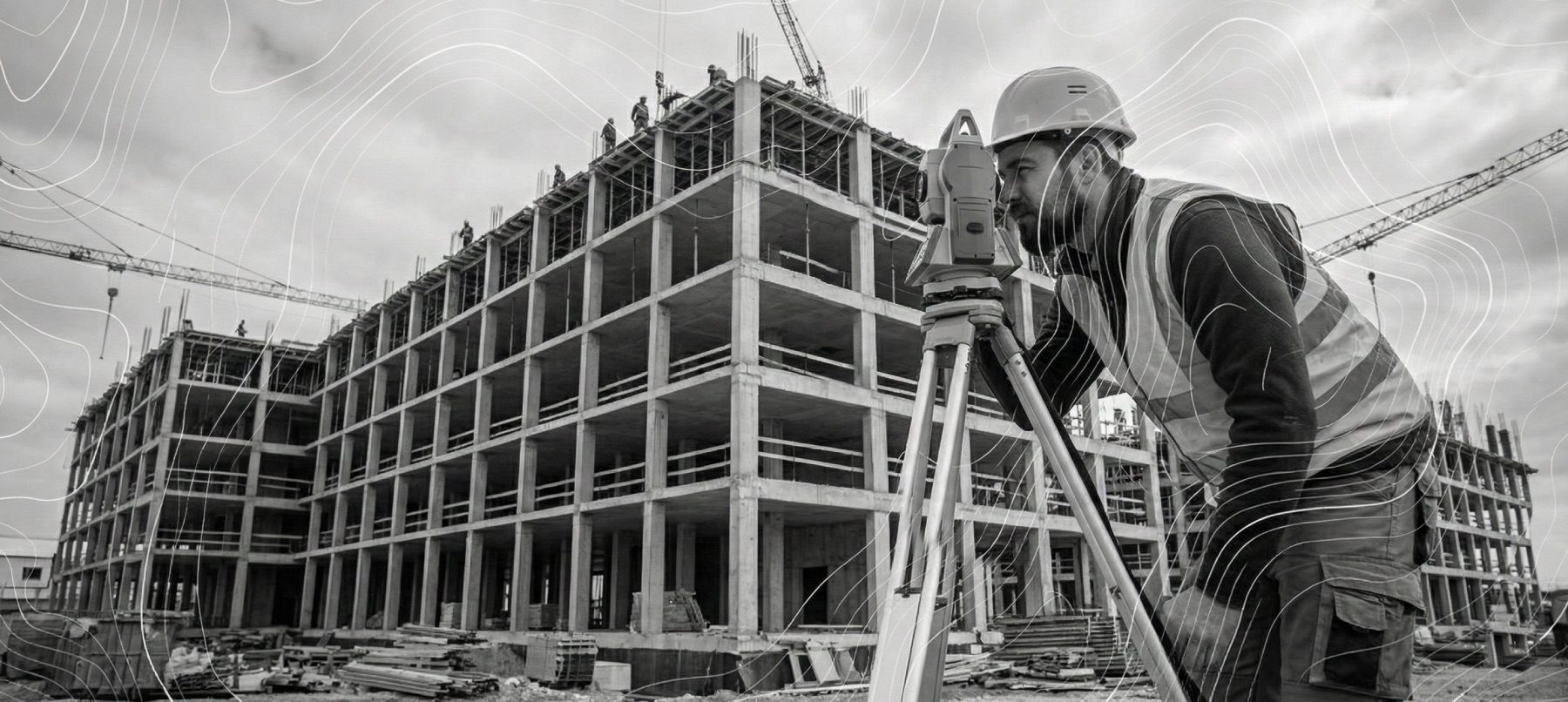 Estación total topográfica de alta precisión en primer plano durante un levantamiento en una obra residencial, con un especialista trabajando al fondo.